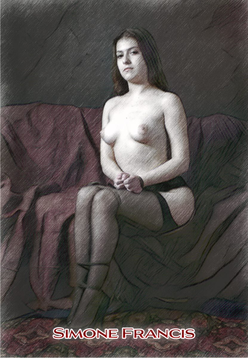 The artist sat and watched, his hand dragging the charcoal frantically over sheet after sheet of paper as if he was bringing himself closer to a climax with each stroke. As he discarded each drawing, and it fell to the floor, it seemed to capture the essence of her awakening passion.